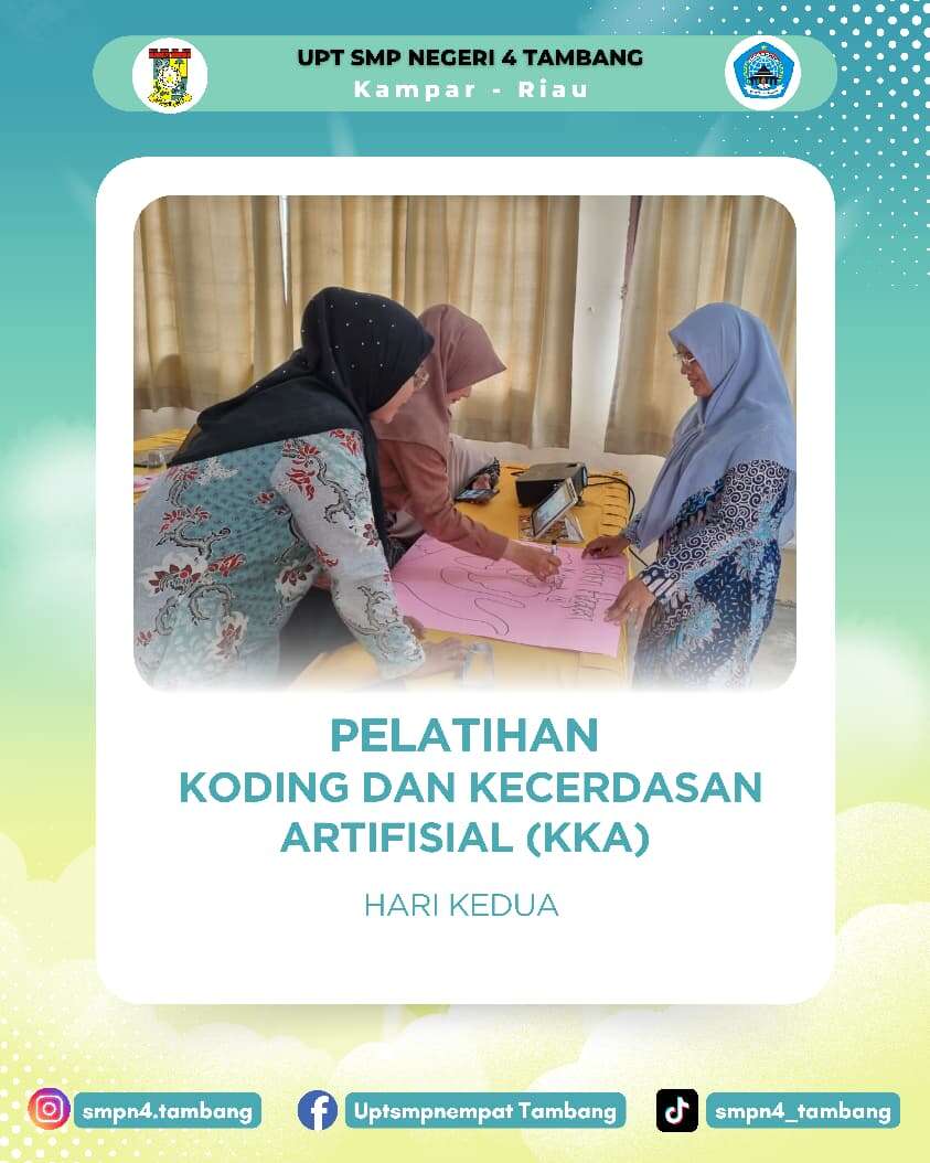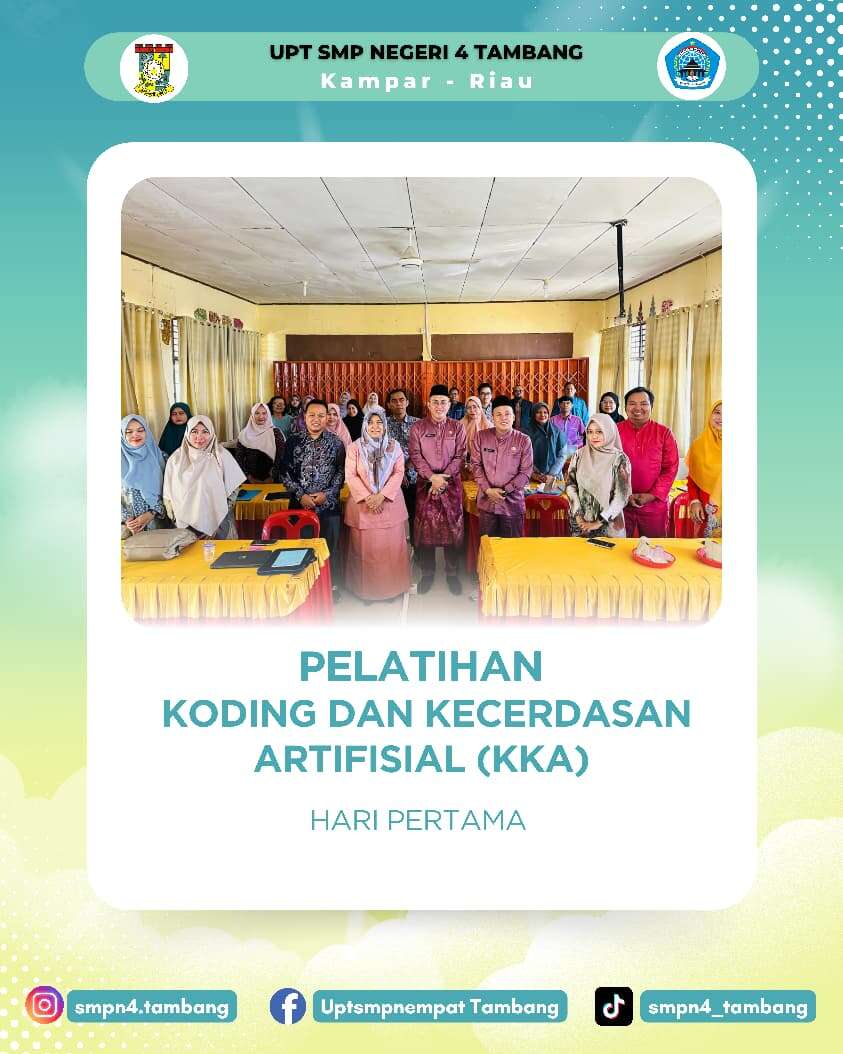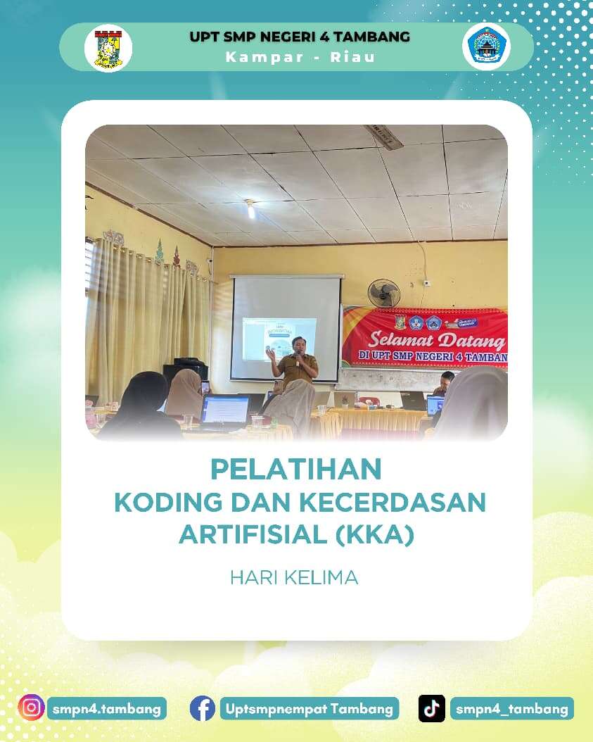 [SMPN 4 Tambang, 6-7 Agustus dan 11-12 Agustus 2025] – Dalam upaya berkelanjutan untuk meningkatkan mutu pendidikan, UPT SMPN 4 Tambang menjadi tuan rumah telah sukses menyelenggarakan Pelatihan KKA (Koding dan Kecerdasan Artifisial) bagi para guru. Acara yang berlangsung pada tanggal 6-7 Agustus dan 11-12 Agustus 2025. Pelatihan ini bertujuan untuk membekali para pendidik dengan pengetahuan dan keterampilan terkini di bidangnya.